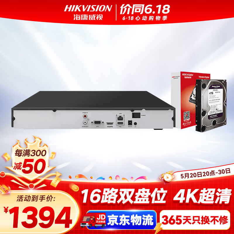 HIKVISION海康威视网络硬盘录像机监控16路双盘位兼容8TNVR满配16个摄像头带4TB硬盘DS-7816N-R2价格:1674.00元!