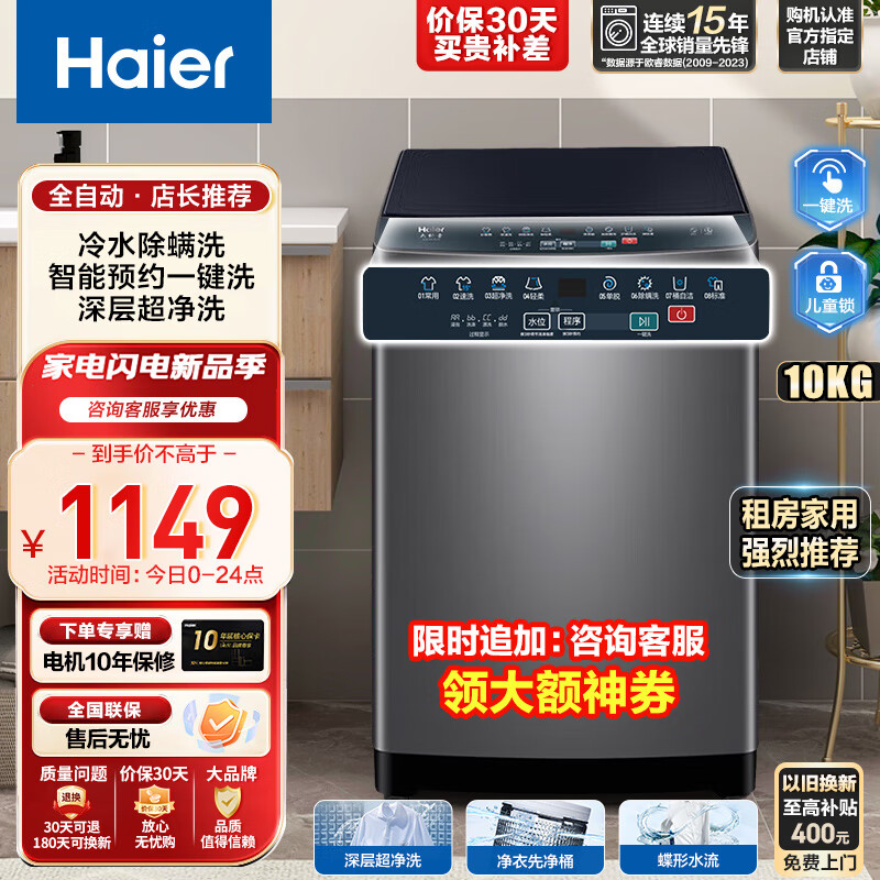 海尔(Haier)波轮洗衣机租房家用全自动10攻击大容量超净速洗除螨洗 一键自清洁智能预约 以旧换新价格:1149.00元!