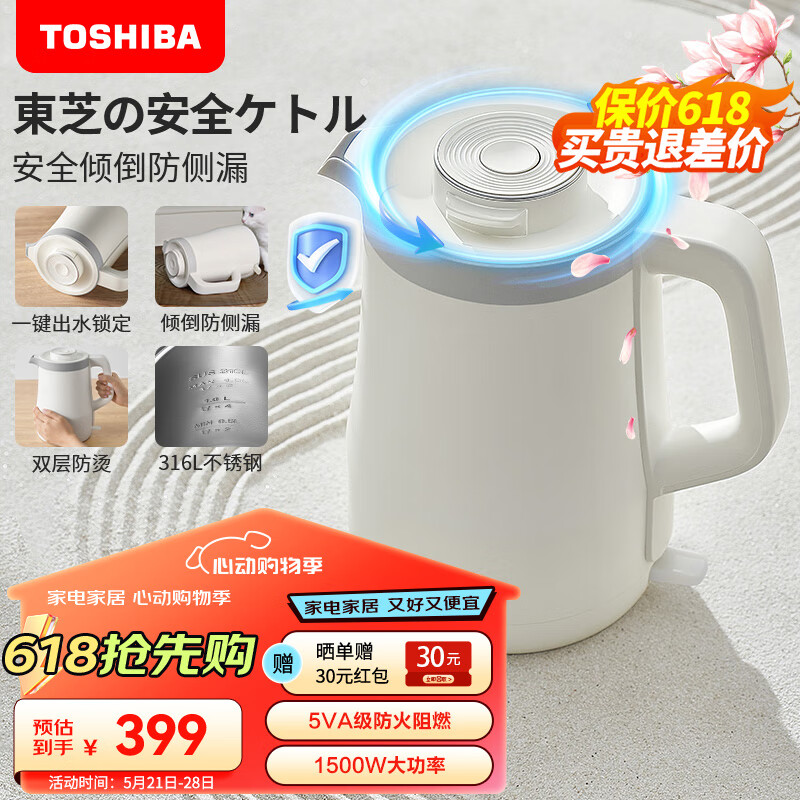 东芝(TOSHIBA)水物语倾倒防侧漏水壶防烫烧水壶电热水壶316L不锈钢1.5升大容量开水壶KT-15DRSC(W)价格:399.00元!