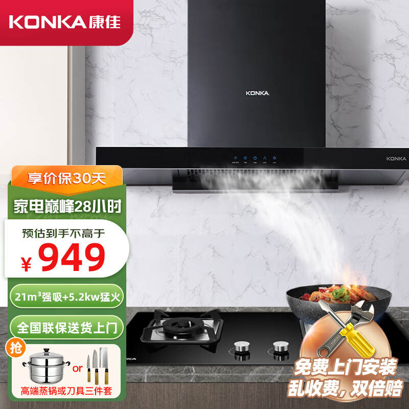 康佳(KONKA)抽油烟机燃气灶具套装 家用欧式21m3/min大吸力挥手自清洗烟灶两件套装 KT55+B500F(天然气)价格:947.00元!