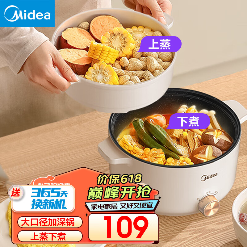 美的(Midea)电煮锅 电炒锅 电蒸锅家用多用途锅 宿舍小火锅 小电锅 3L小容量电热一体锅 电炖锅 泡面锅 MC-HGE2511 带蒸笼 3L价格:169.00元!