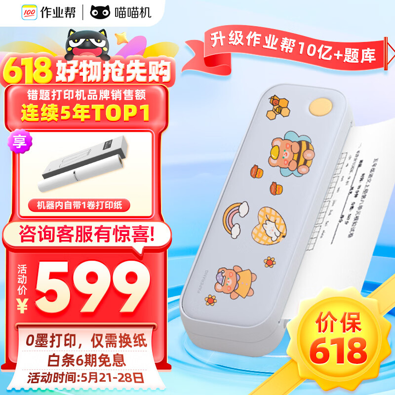 喵喵机A4高清错题学习打印机作业帮家用错题整理神器无墨打印小型便携桌面热敏打印机F2S AI智学版价格:599.00元!