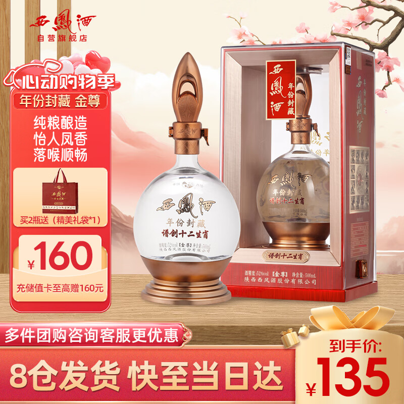 西凤酒 年份封藏52度金尊陕西纯粮食凤香型白酒水宴请送礼盒装500mL*1价格:135.00元!
