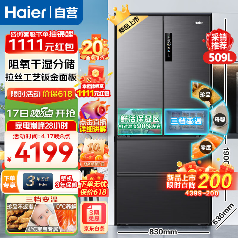 海尔(Haier)509升冰箱超薄法式多门四开门变频节能新一级冰箱风冷无霜双循环黑金净味除菌电冰箱价格:4299.00元!