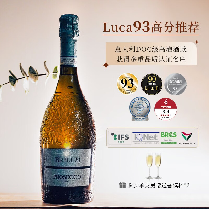 露颂【国际金奖&高颜值】意大利原瓶进口DOC级起泡白葡萄酒配2香槟杯 闪耀普罗塞克白起泡 单支装价格:208.00元!