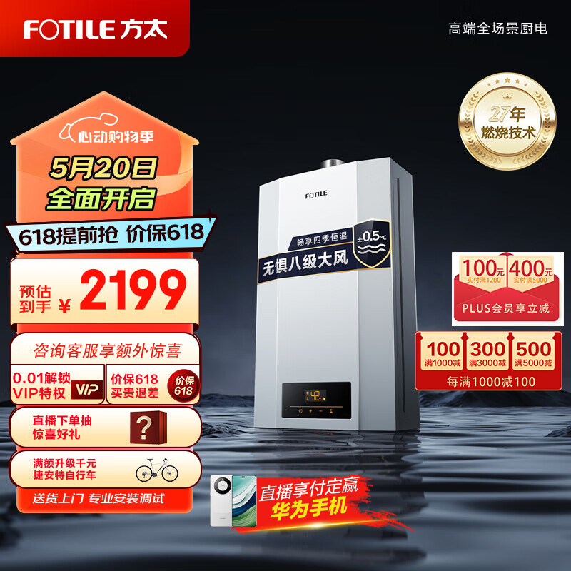 方太天然气16升燃气热水器 家用强排式 智能恒温变频 高层抗风低水压启动 多点用水不干扰JSQ30-P16D1价格:2399.00元!