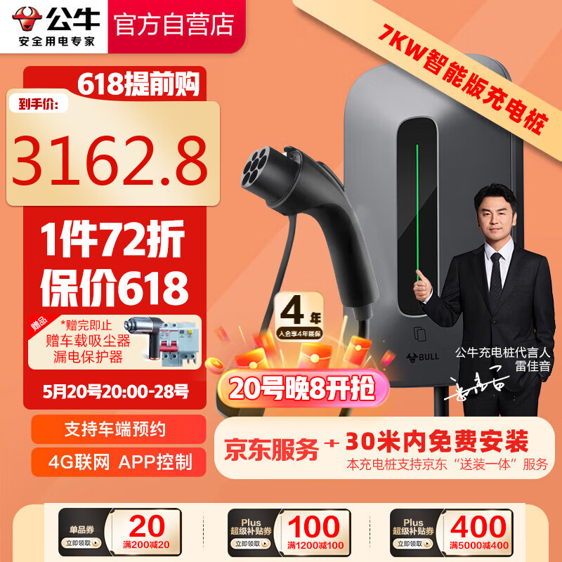公牛新能源汽车交流充电桩适配于小米su7汽车特斯拉比亚迪极氪问界小鹏理想蔚来 7KW智能款 30米安装价格:4394.00元!