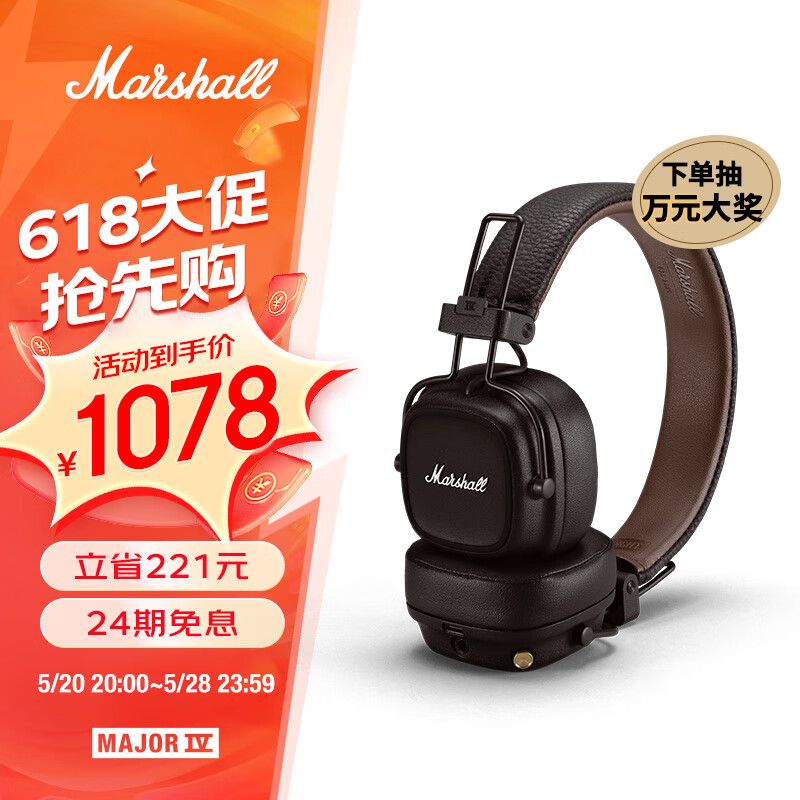 MARSHALL(马歇尔)MAJOR IV耳机头戴式无线蓝牙重低音可折叠4代耳麦 棕色价格:1078.00元!