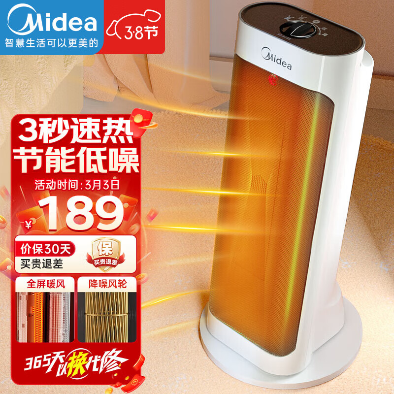 美的(Midea) 暖风机家用取暖器电暖器电暖气片暖风电热扇热风机烤火炉广角摇头节能 【全屏大面积出风 速热升温】价格:299.00元!