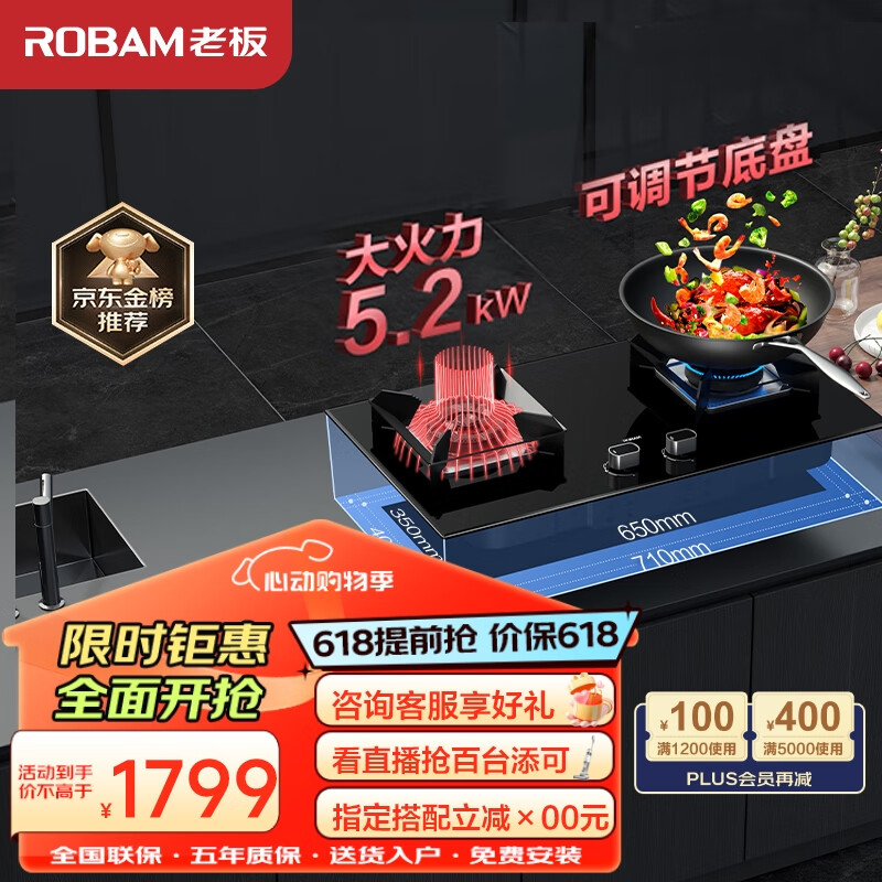 老板(Robam)JZT-57B2D家用大火力嵌入式燃气灶5.2kW 钢化玻璃易清洁 可调节底盘 高热效(天然气)价格:1899.00元!