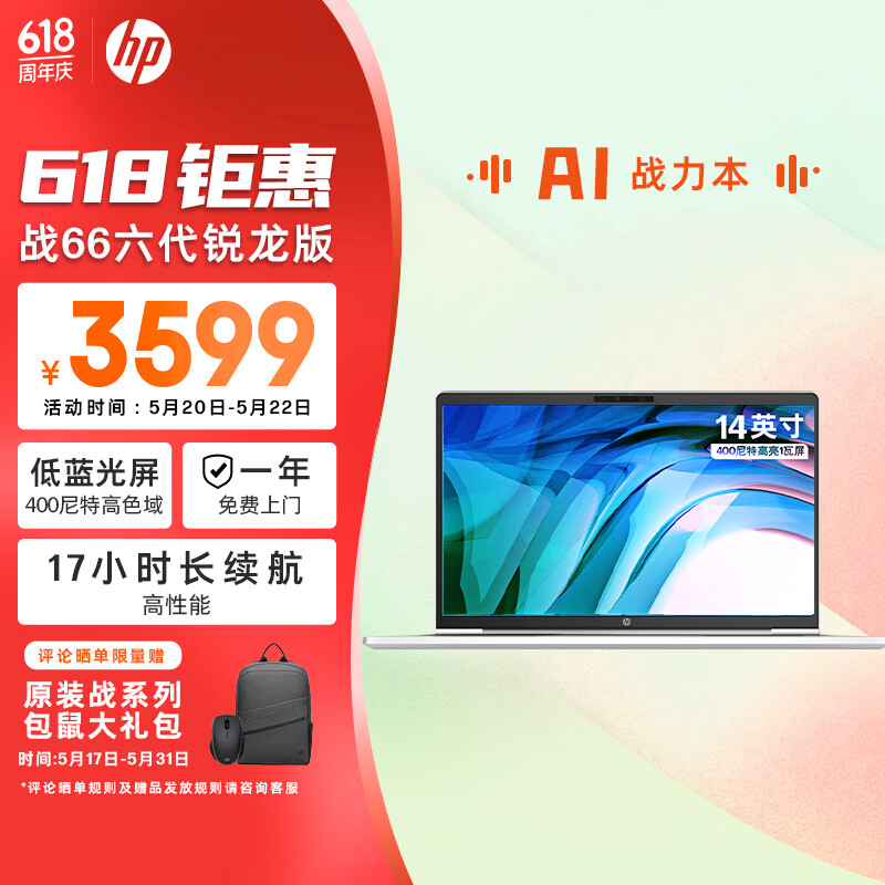 惠普(HP)战66六代锐龙版14英寸轻薄本笔记本电脑(高性能R5 16G 1T 长续航 高色域低蓝光 AI新体验)价格:3599.00元!