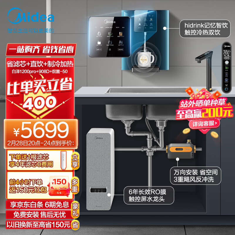 美的(Midea)省芯直饮加热净水器套装【白泽1200pro+管线机908D+前置-50】反渗透 家用壁挂式加热一体净饮机价格:5699.00元!
