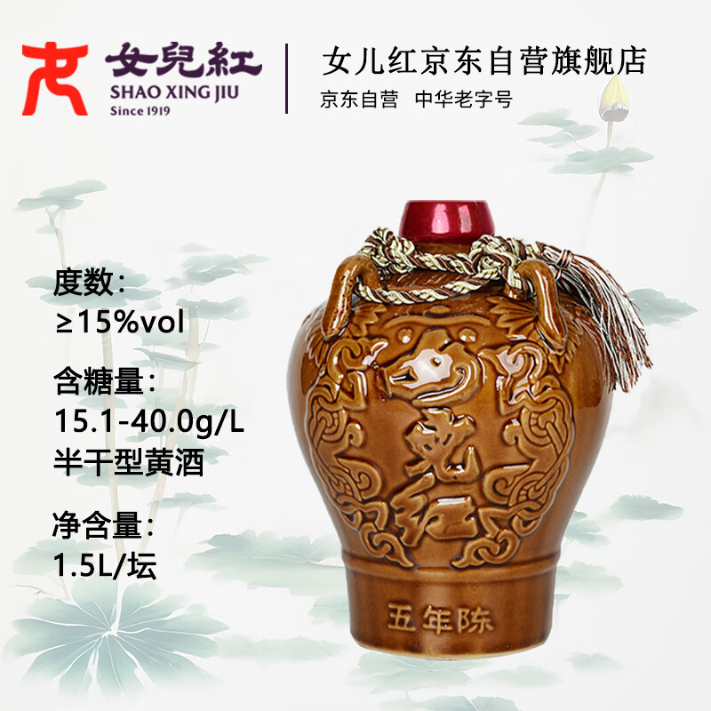 女兒红 精品五年 半干型 绍兴黄酒 1.5L(新老包装随机发货)价格:38.00元!