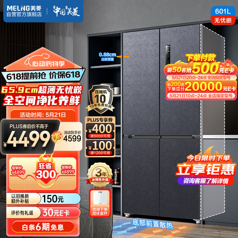 美菱(MeiLing)601升超薄零嵌入式十字双开对开四开门冰箱家用双变频一级能效风冷无霜BCD-601WPU9CT超大容量灰价格:4899.00元!
