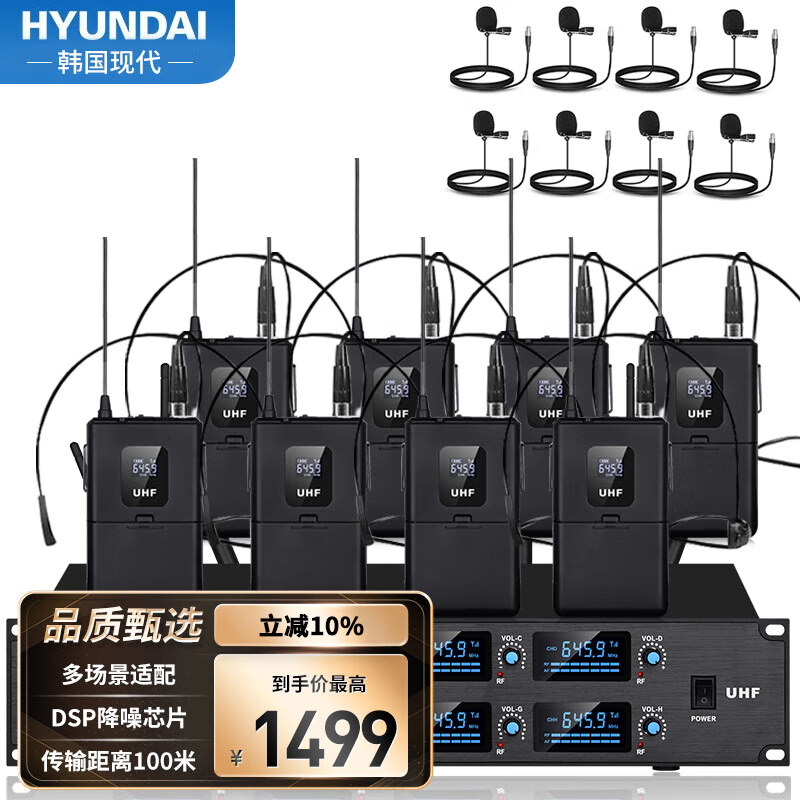 HYUNDAI HD-08 专业一拖八头戴无线话筒桌面会议舞台演讲电容头戴麦克风一拖八(八头戴+八领夹线)价格:1659.00元!