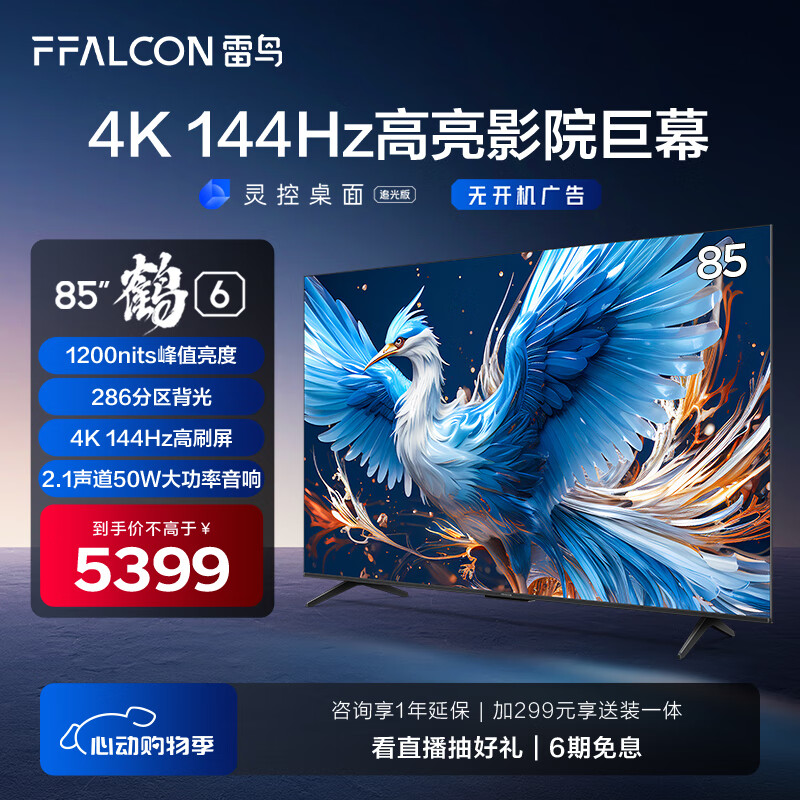 FFALCON雷鸟 鹤6 24款 85英寸游戏电视 144Hz高刷 4K超高清 4+64GB 智能液晶平板电视机85S575C PRO价格:5999.00元!