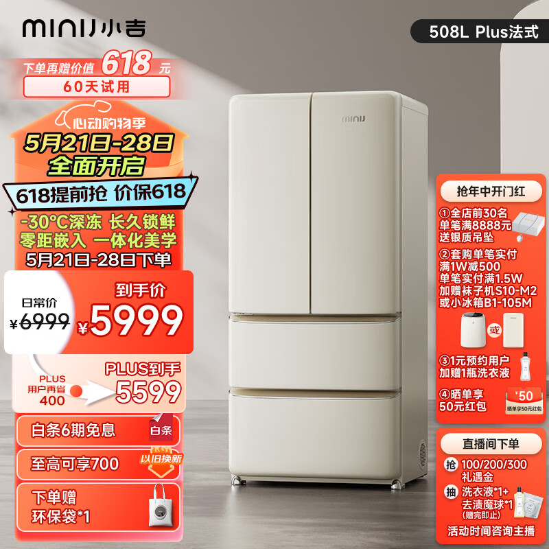 小吉(MINIJ)【保价618】508L Plus超薄零嵌双变频一级能效法式多门客厅冰箱干湿分储变温低噪BCD-508WB价格:5999.00元!