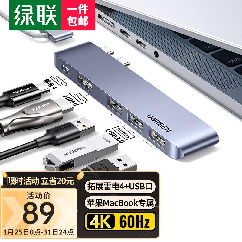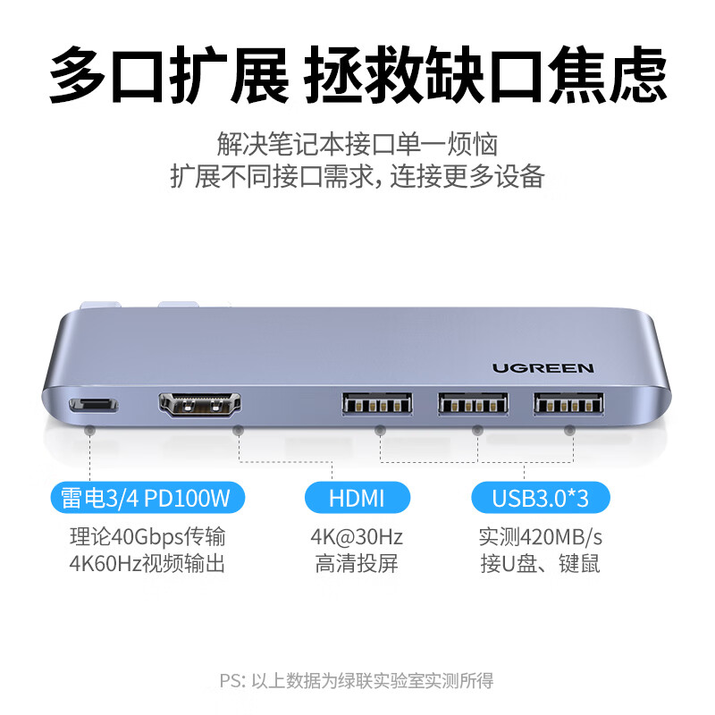 绿联Type-C扩展坞苹果直插式拓展坞USB分线器MacBookPro/Air笔记本雷电3/4HDMI转接头转换电脑集线器价格:89.00元!