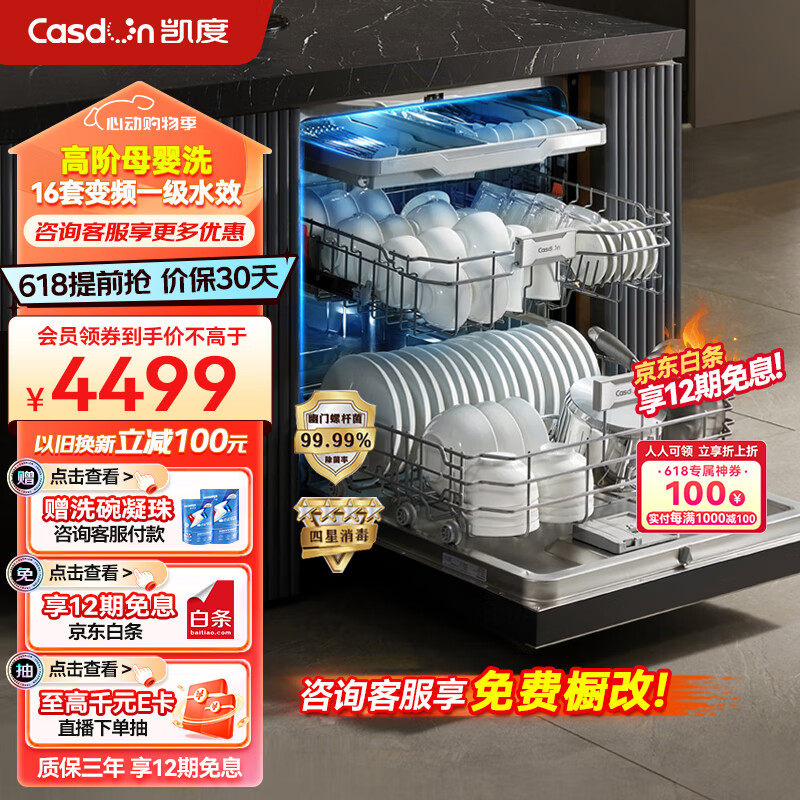 凯度(CASDON)全自动家用烘干独立式 一级水效 智能16套母婴洗碗机嵌入式免费橱改 KD3DJR-16J3S价格:4899.00元!