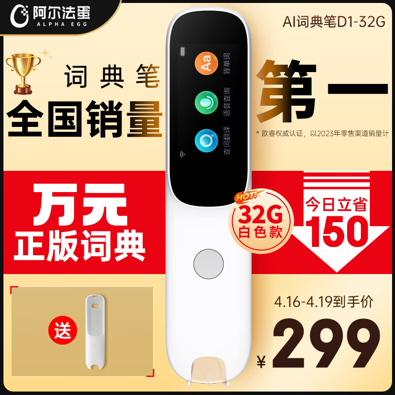 阿尔法蛋AI词典笔D1 32G 冰雪白 点读笔英语学习翻译神器 翻译笔扫描笔 单词笔学习笔中小学生电子词典价格:299.00元!