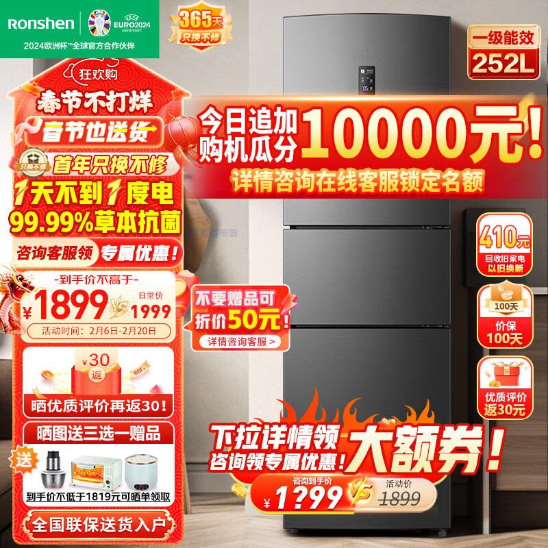 容声(Ronshen)252升三门三温冰箱一级双变频风冷无霜低噪节能家用大容量宽幅变温BCD-252WD18NP价格:1899.00元!