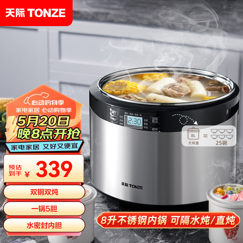 天际(TONZE)电炖锅 电炖盅 隔水炖锅 煲汤锅炖汤锅 熬粥燕窝养生锅 婴儿煮粥锅 不锈钢DGD35-35EWG 3.5L价格:339.00元!