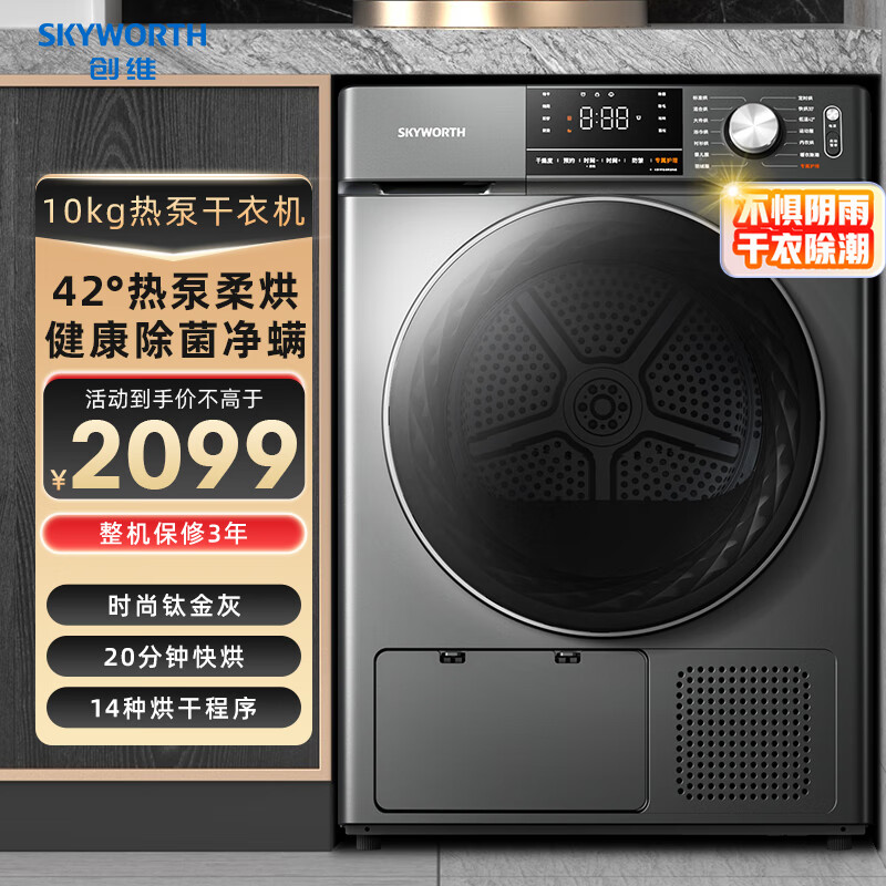 创维(SKYWORTH)烘干机 家用热泵式干衣机 大容量滚筒10公斤防缠绕 除菌除螨除潮 祛除宠物毛发H100KS价格:2099.00元!