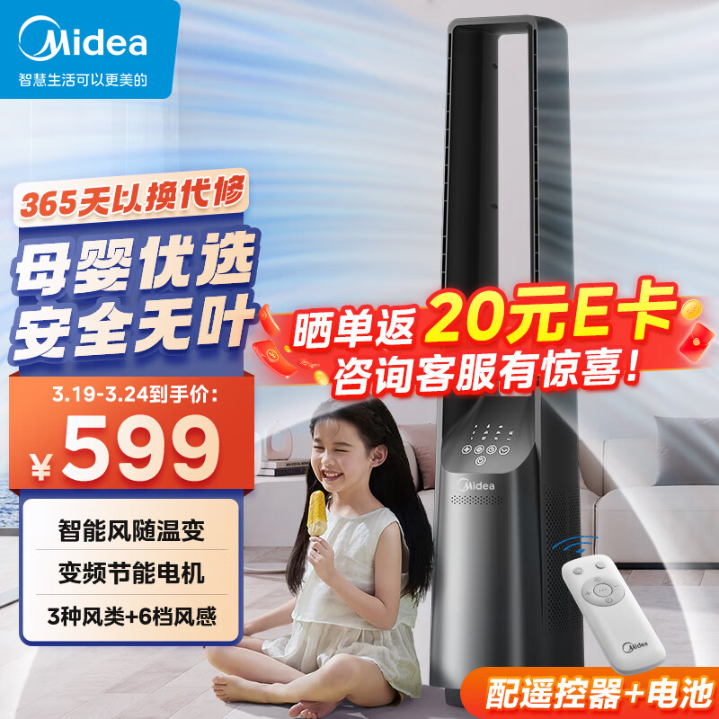 美的(Midea)【风随温变】母婴级变频轻音无叶风扇/智能感温电风扇/家用遥控落地扇/摇头定时塔扇 AMS150G-ZR价格:739.00元!