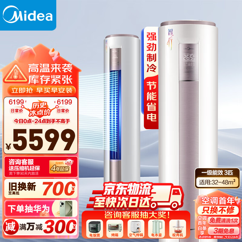美的(Midea)智行三代自清洁一级能效3匹空调变频冷暖两用制冷制热柜机立式客厅大出风口空调家电以旧换新YH200价格:5599.00元!