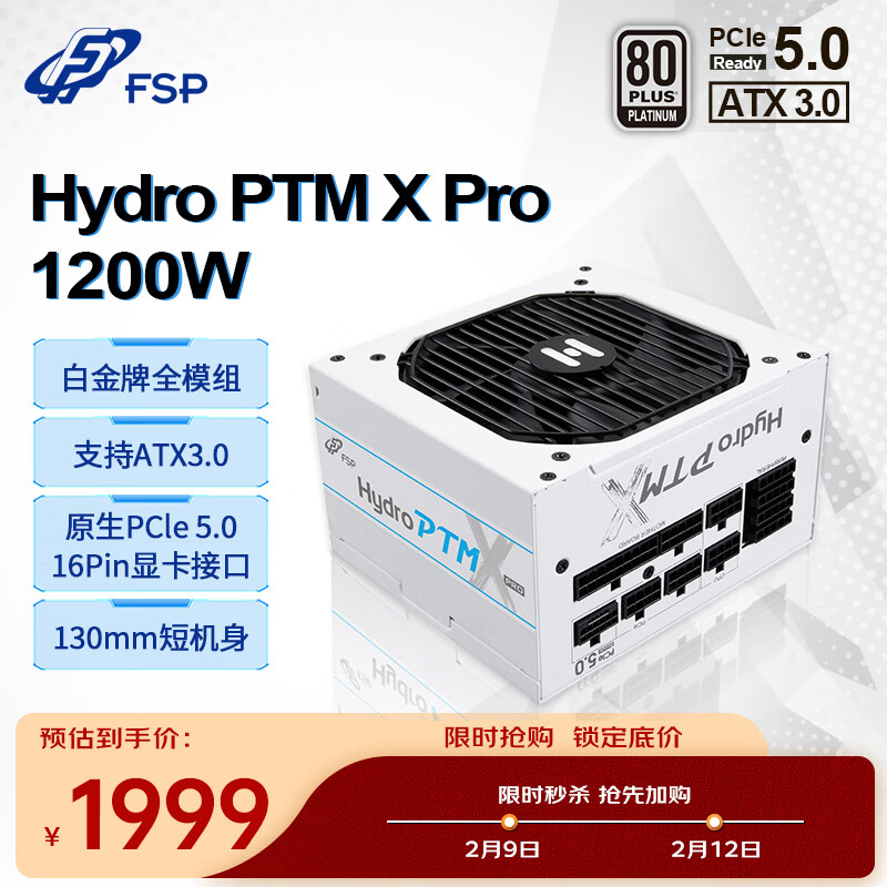 全汉(FSP)Hydro PTM X Pro1200W白金牌雪装版全模组电源(ATX3.0/PCI-E5.0接口/130mm短机身)价格:1939.60元!