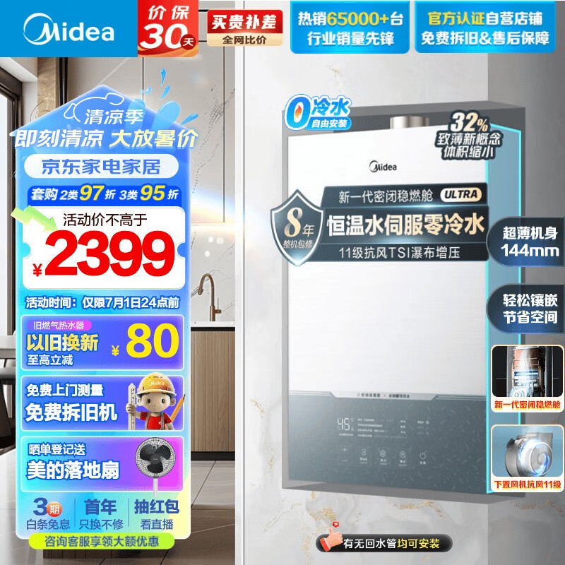 美的(Midea)16升燃气热水器 天然气 恒温水伺服 零冷水 TSI增压 抗风 新一代密闭稳燃舱 JSQ30-MATE Ultra无相价格:2399.00元!