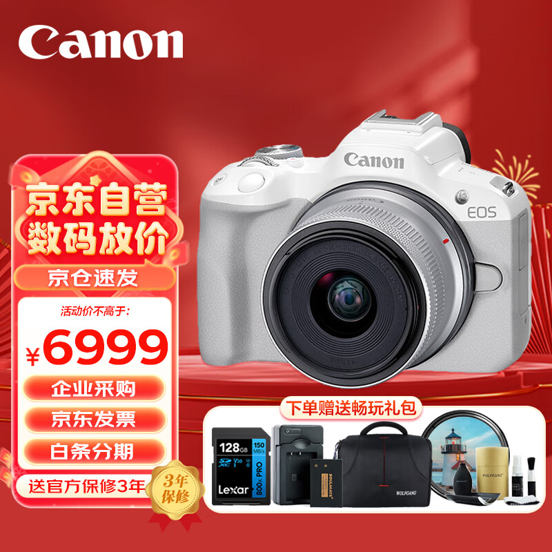 佳能(Canon)EOS R50 小型便捷微单数码相机 4K Vlog高清视频家用旅游美颜照相机 18-45mm套机 白 旅行畅玩套装价格:6999.00元!