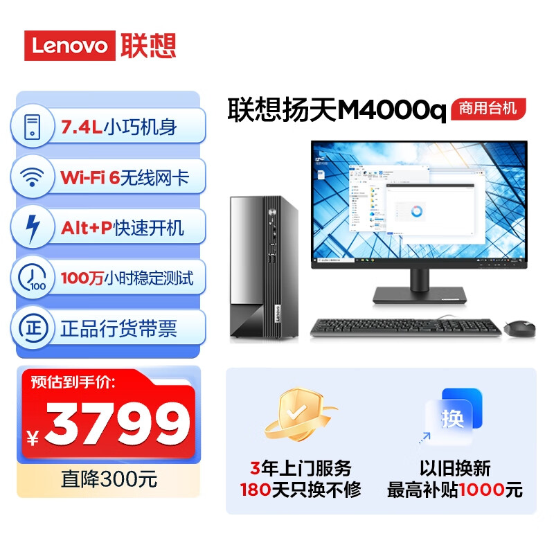 联想(Lenovo)扬天M4000q 商用办公台式电脑主机(酷睿13代i5-13400 16G 1TB SSD)21.45英寸价格:3799.00元!