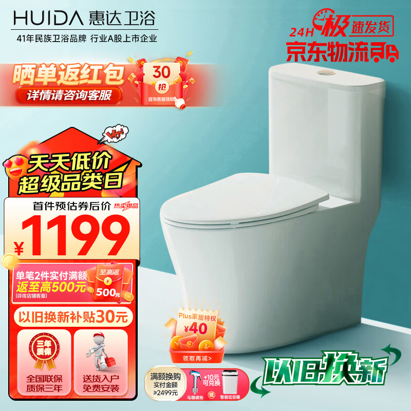 惠达(HUIDA)抽水马桶家用大冲力节水虹吸式卫生间坐便器HDC6360B 400坑距价格:1439.00元!