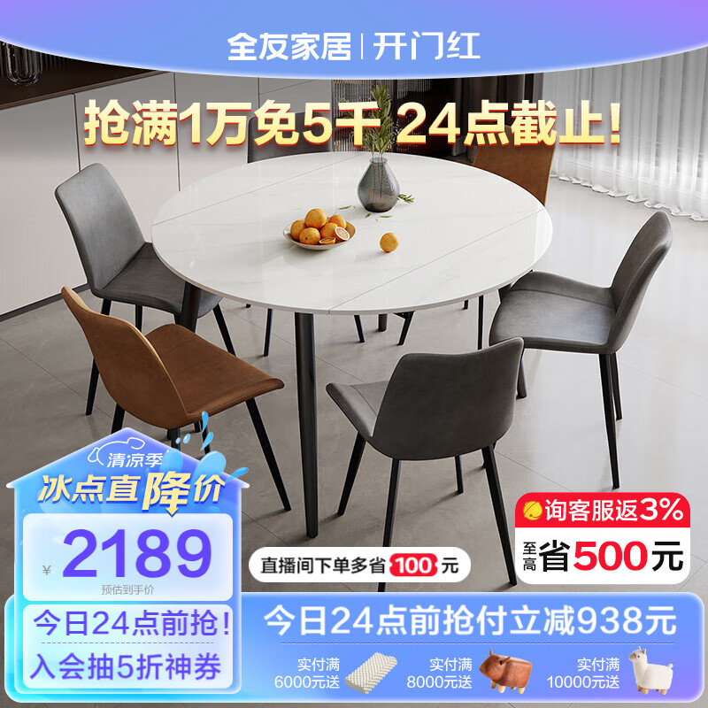 全友家居 家用意式极简可伸缩可方可圆客厅岩板餐桌椅组合126702价格:3127.14元!