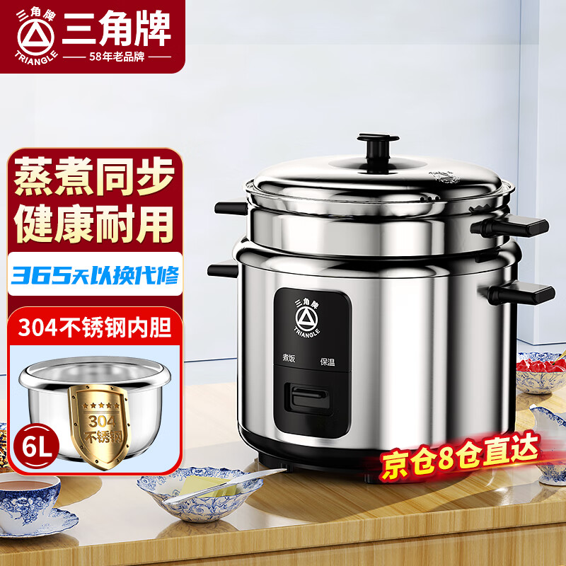 三角牌(Triangle)电饭煲家用电饭锅6L大容量煮饭锅304不锈钢内胆老式米饭锅带蒸笼 TG-Z60x12Z价格:181.00元!
