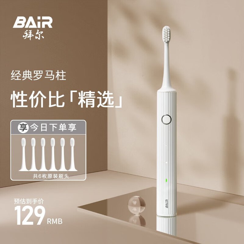 拜尔(BAIR)A8电动牙刷成人声波智能扫振深度清洁美白护龈学生党女生情侣女全自动充电式青少年软毛送男女朋友 【无极变速】豪华6刷头-白色价格:118.00元!