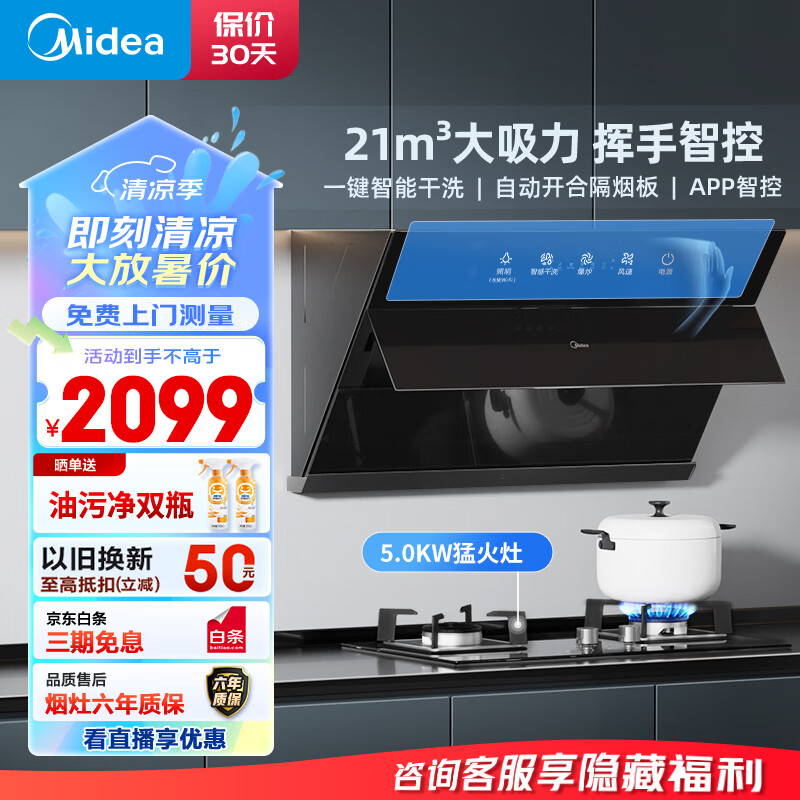 美的(Midea)抽油烟机燃气灶套装 侧吸式家用脱排烟机灶具套装 21风量自智能挥手自动清洗J39+Q330天然气价格:2099.00元!