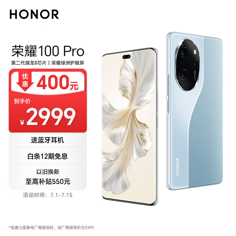 荣耀100 Pro 单反级主摄 荣耀绿洲护眼屏 第二代骁龙8旗舰芯片 AI手机 12+256 迷蝶蓝 5G价格:2999.00元!