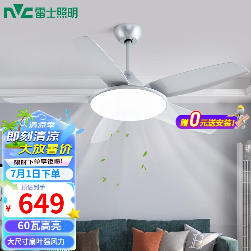 雷士(NVC)风扇灯大尺寸开叶吊扇灯简约客厅餐厅变频六档强劲风银色高亮60瓦价格:926.00元!