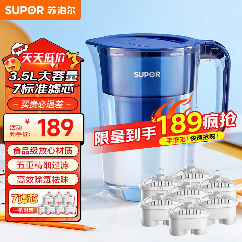 苏泊尔(SUPOR)净水壶自来水活性炭过滤器家用厨房净水器直饮滤水器滤水壶UF03【一机七芯】价格:199.00元!
