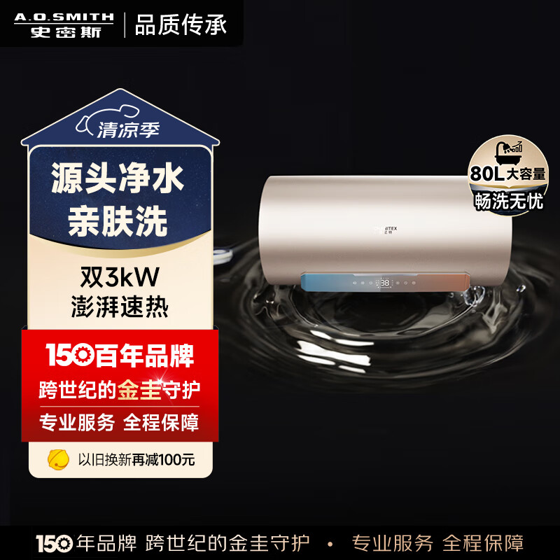 史密斯(A.O.SMITH)佳尼特80升电热水器 专利免清洗 金圭内胆更耐用 双棒双3kW速热CTE-80KB以旧换新价格:2099.00元!
