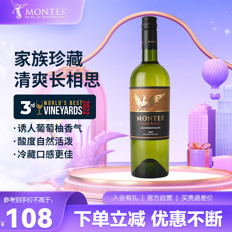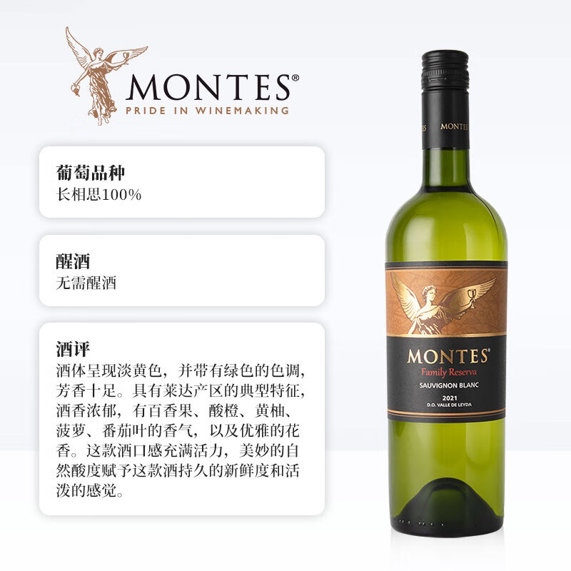 MONTES蒙特斯家族珍藏长相思红酒白葡萄酒750ml圣诞礼物智利原瓶进口价格:99.00元!