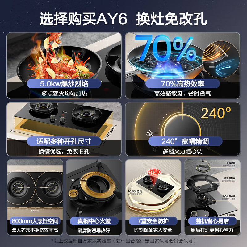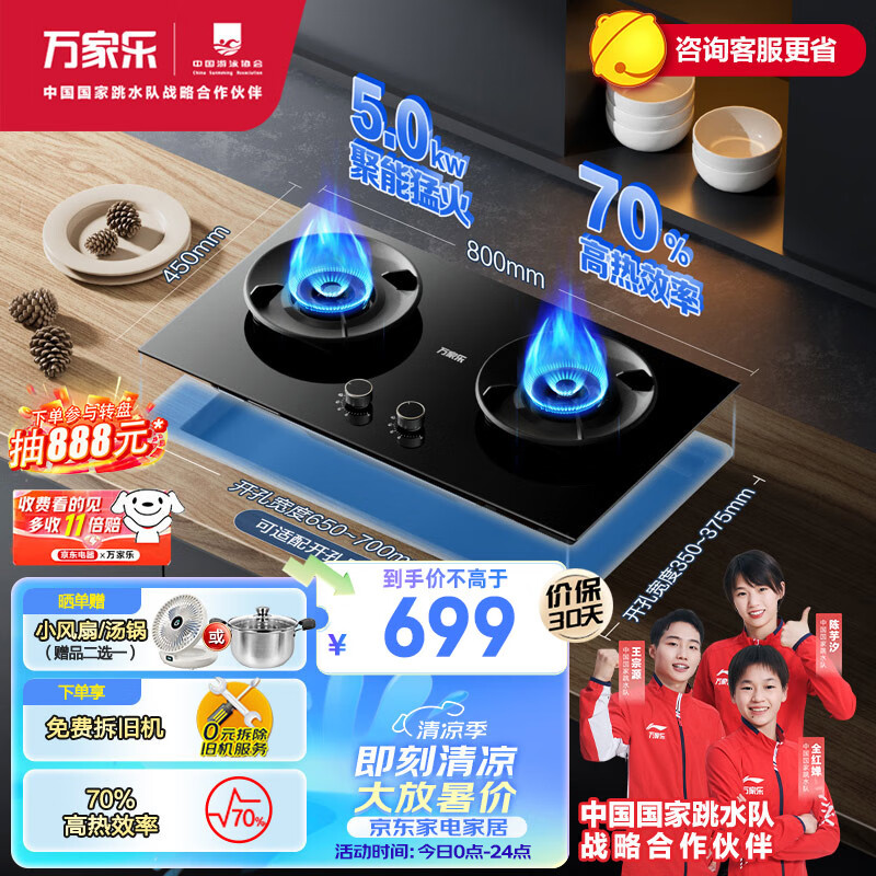 万家乐燃气灶 5.0kw大火力 70%热效率台式嵌入式两用燃气灶双灶 可适配开孔尺寸全进风天然气灶JZT-AY6价格:799.00元!