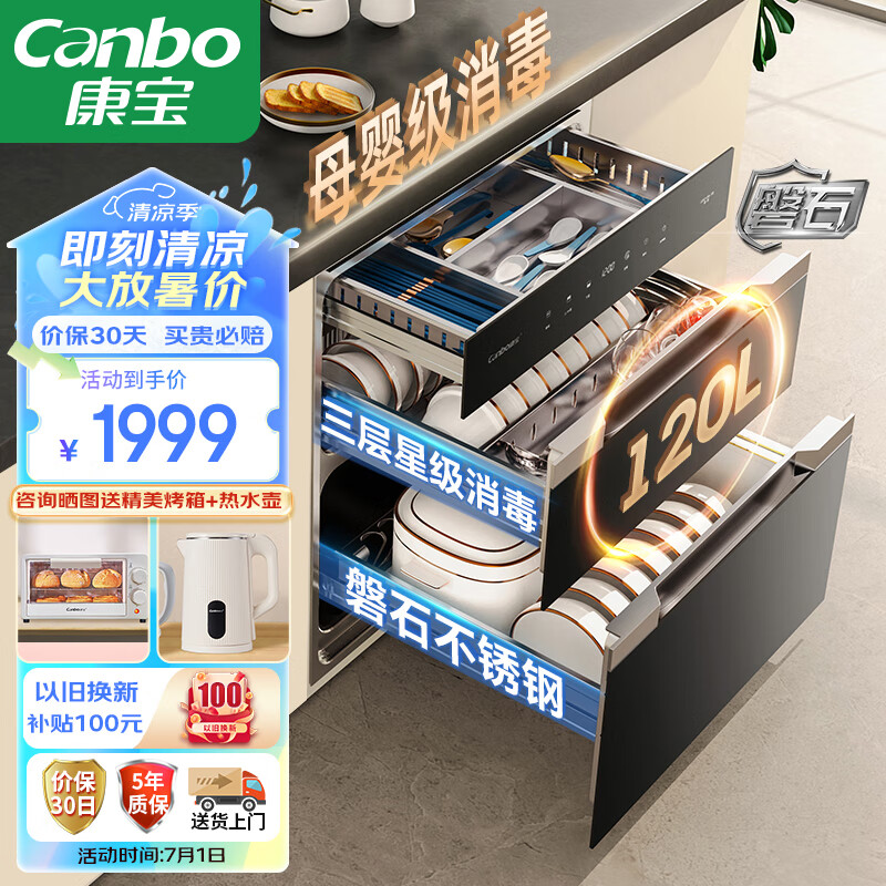 康宝(Canbo)120L磐石PRO三层不锈钢消毒柜嵌入式家用大容量高温餐具碗筷母婴儿奶瓶二星热风消毒碗柜XDZ120-V8价格:1999.00元!