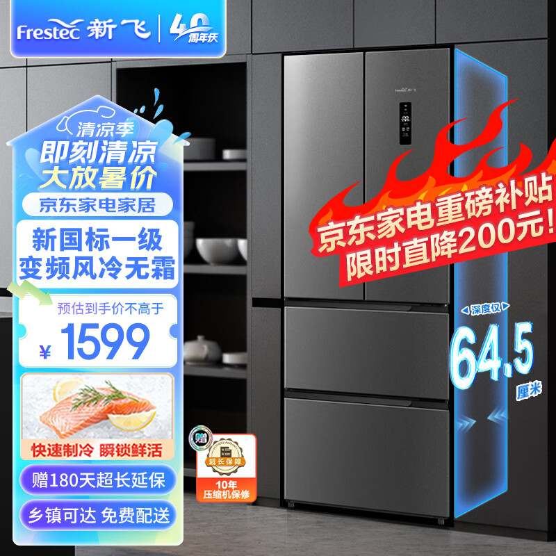 新飞(Frestec)310升超薄可嵌入法式变频四门多门多维风冷无霜一级能效家用电冰箱 BCD-310WK7CT价格:1699.00元!