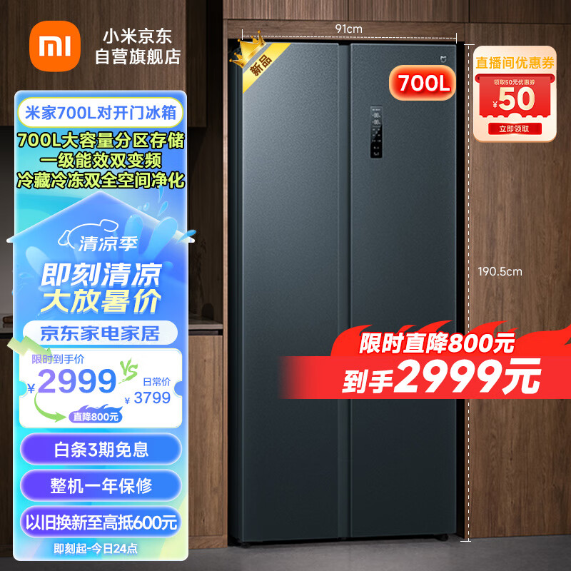 米家小米700L双开门大容量家用冰箱对开门风冷无霜一级能效【双变频净味除菌】以旧换新BCD-700WMSA价格:2999.00元!