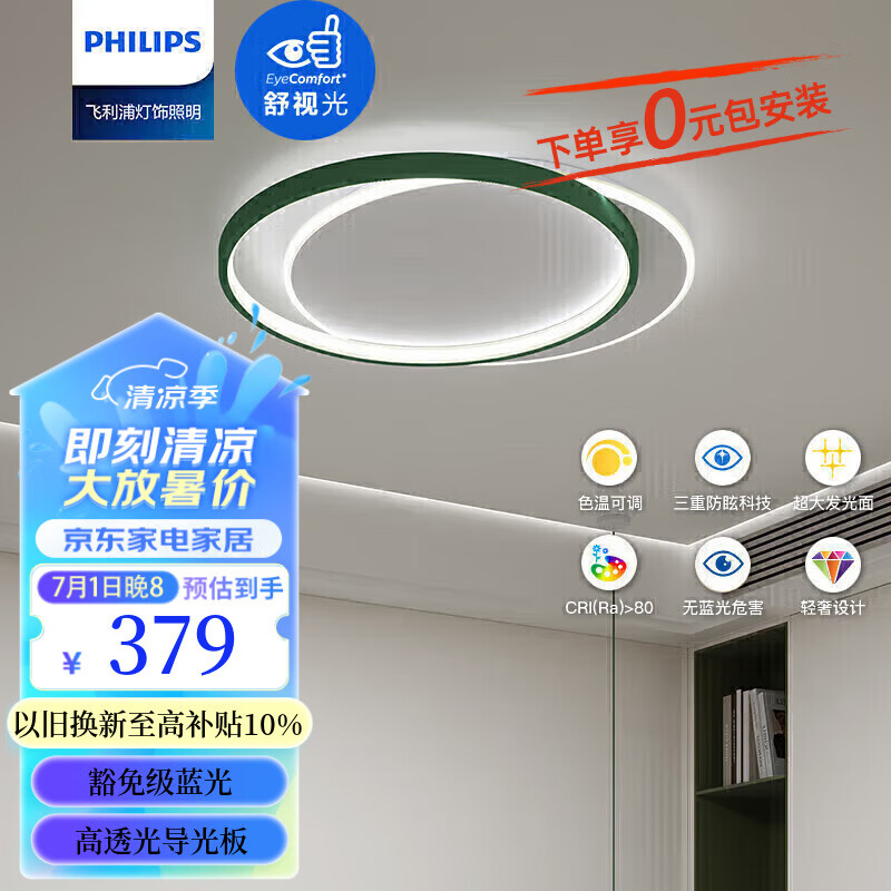 飞利浦(PHILIPS)全光谱LED吸顶灯卧室灯客厅灯书房儿童房灯饰灯具环慕45W罗勒绿价格:419.00元!