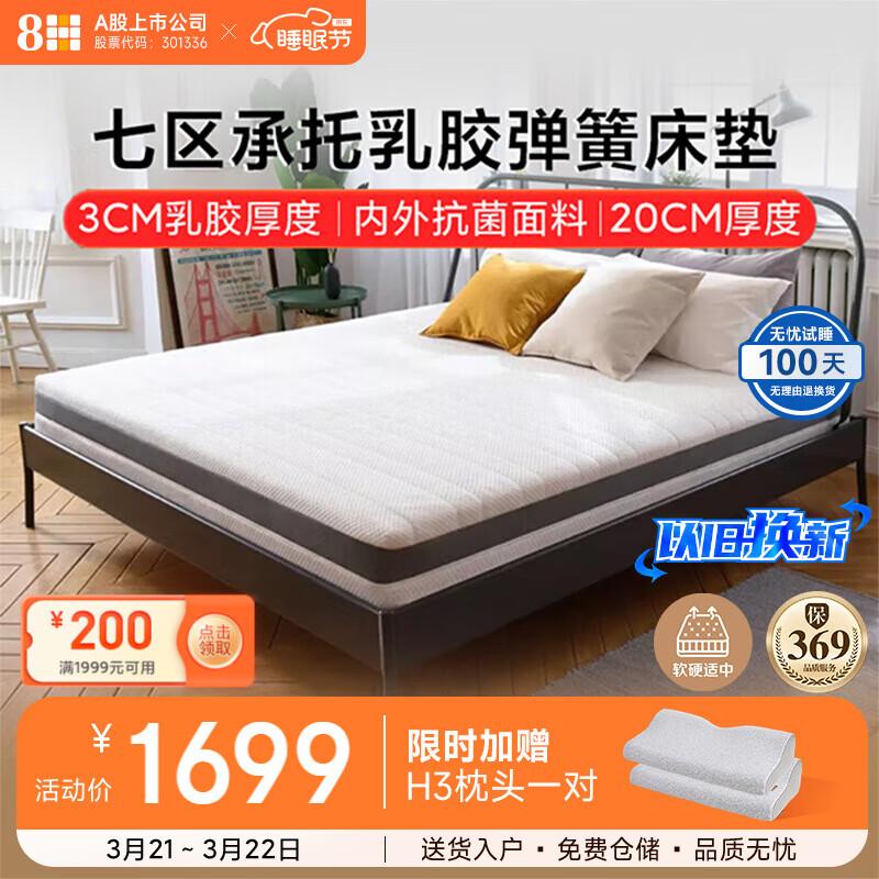 8H乳胶床垫子1.8米*2米独立袋弹簧床垫成人双人榻榻米席梦思M3Air价格:2149.00元!