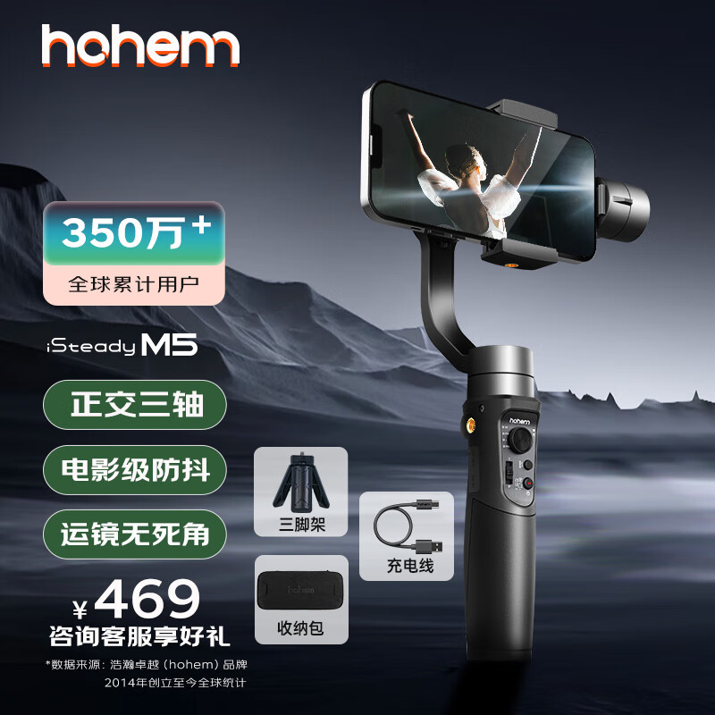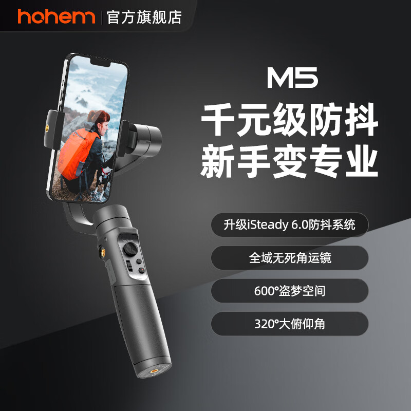浩瀚(hohem)M5 手机稳定器 手持手机云台 三轴防抖云台稳定器 专业摄影 全域无死角运镜 俯仰320°大角度价格:509.00元!
